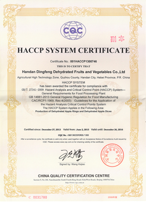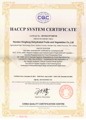 HANDAN DINGFENG DEHYDRATED FRUITS AND VEGETABLES CO.,LTD ADDRESS:Agricultural High Technology Zone,Quzhou County,Hebei Province, China